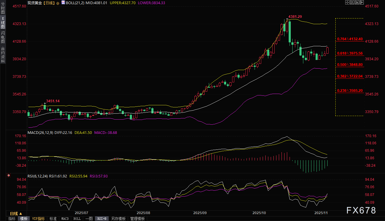 若出现看跌K线并持续交投于4000美元下方,则可能表明卖方重新掌控局面。届时金价可能回落至布林带下轨3835美元,随后为100日EMA 3705美元。