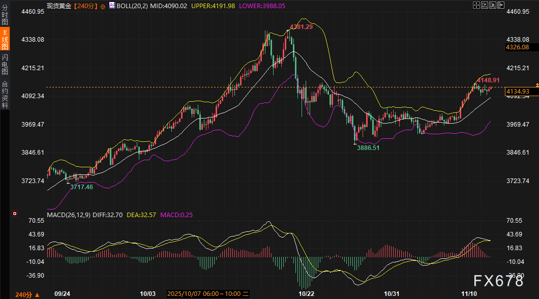 转向技术层面,现货黄金的240分钟图显示出清晰的建设性格局,价格在4133.85美元/盎司附近盘整,日内涨幅0.18%,守稳三周高位。布林带(参数202)中轨位于4090.00美元/盎司,上轨4191.95,下轨3988.05,当前价格贴近中上轨区间,通道整体向上倾斜,暗示多头主导的延续性。MACD指标(参数26129)DIFF线32.71,DEA线32.57,二者小幅金叉后趋平,柱状图动能虽放缓,但零轴上方运行维持了买入信号的完整性。这一组合反映出黄金在近期反弹后的消化阶段:上行动能未尽,却面临美元反弹的外部牵制,导致短期内横盘成为主旋律。